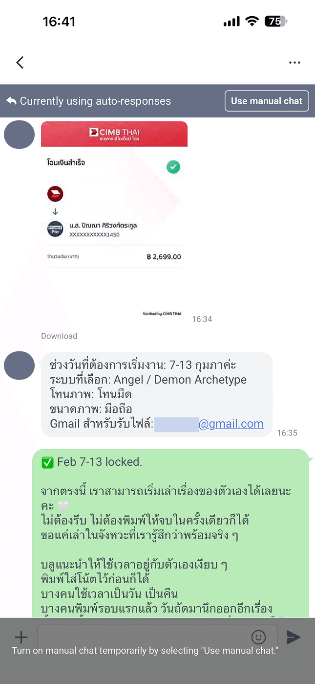 เมื่อข้อมูลครบถ้วนแล้ว บลูจะยืนยันคิวให้ (หมายเหตุ 3-6 วันของการคัสตอมที่เราจอง บลูจะไม่รับงานคัสตอมของคนอื่นเข้ามาซ้อนค่ะ)