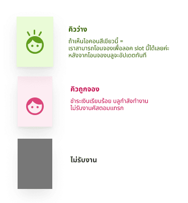 สีเขียว = คิวว่าง ถ้าเห็นไอคอนสีเขียวนี้ = เราสามารถโอนจองเพื่อลอค slot นี้ได้เลยค่ะ หลังจากโอนจองบลูจะอัปเดตทันที