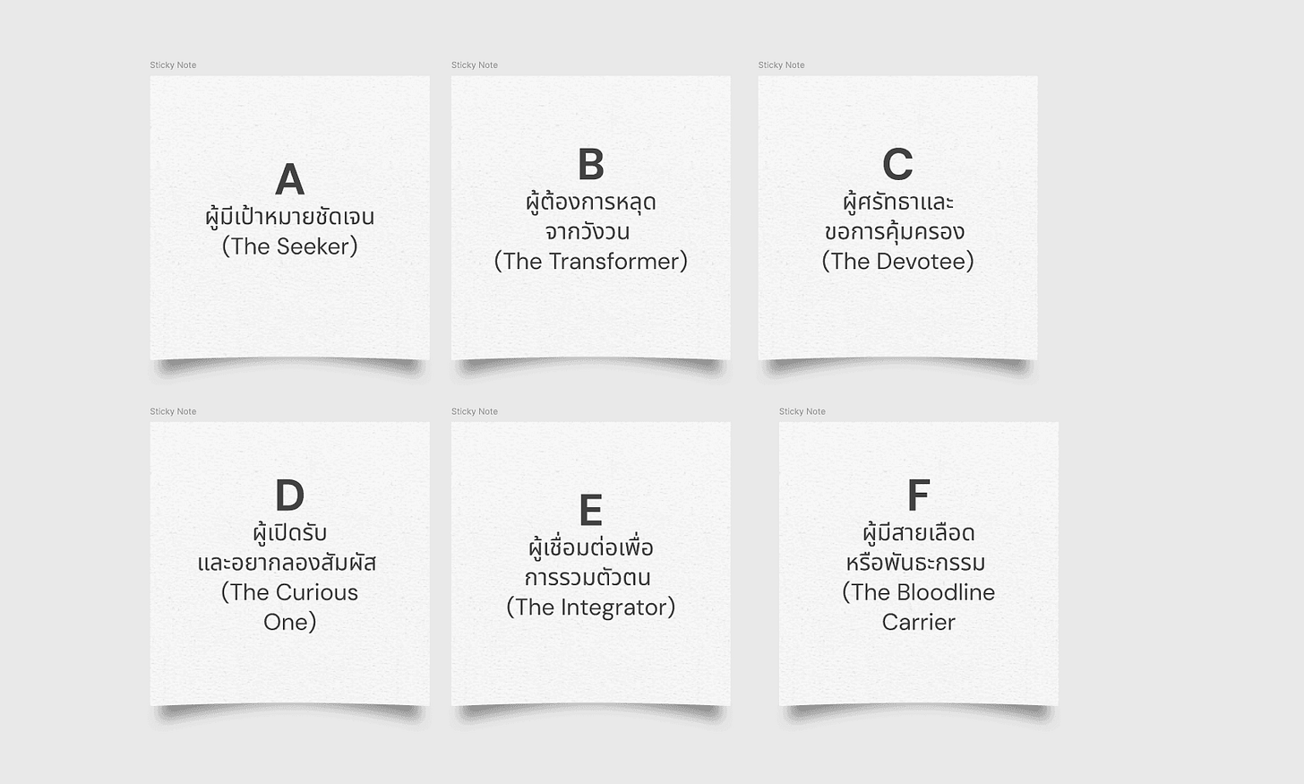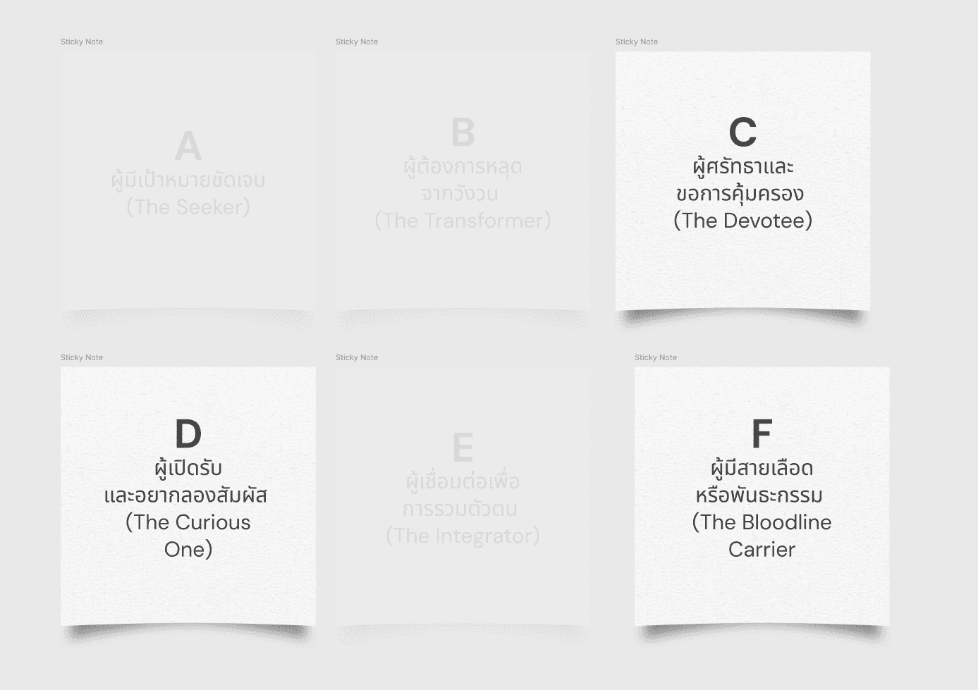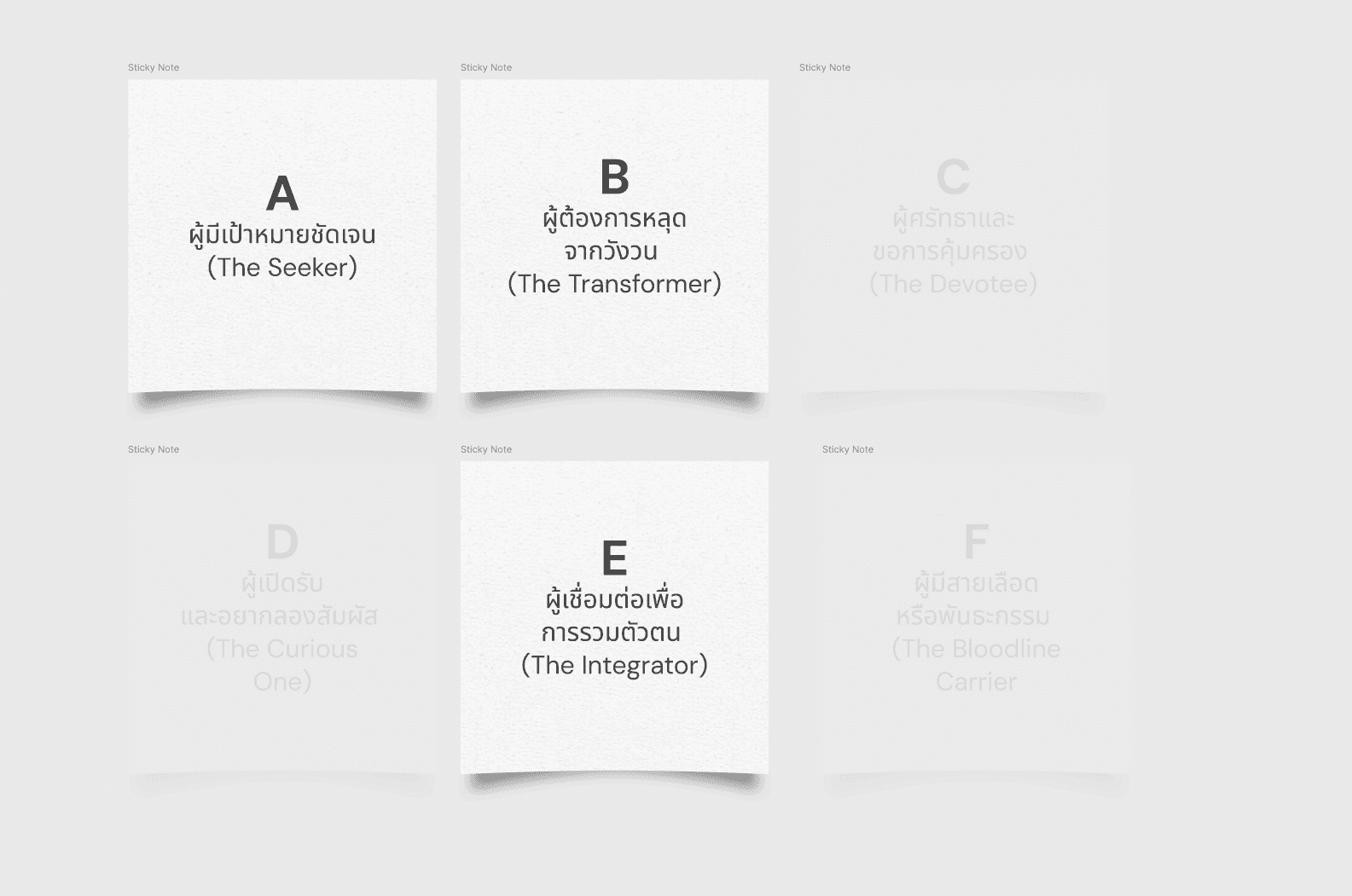 ผู้มีเป้าหมายชัดเจน (The Seeker)รู้ว่าอยากได้อะไร รู้ว่าอยากให้ชีวิตขยับไปทางไหน แต่เป้าหมายนั้นไม่ใช่เรื่องง่ายหรือเรื่องเดียว ชีวิตมีหลาย Layer (มีเป้าหมายชัดเจนแต่ซับซ้อน เงื่อนไขเยอะ บอกได้เป็นฉากๆ ว่ามีเป้า 1234 ชัด ลึก เจาะจง)ผู้ต้องการหลุดจากวังวน (The Transformer)ติดลูปเดิมๆ อยากแก้ปัญหาเพื่อเปลี่ยนแปลงบางอย่าง ชีวิตเราอาจไม่ได้พังจนแตกสลาย แต่มีบางอย่างติด บางอย่างวน และบางอย่างค้างมานาน อาจเป็นสถาณการณ์เดิม รูปแบบความสัมพันธ์เดิม หรือปัญหาที่กลับมาในรูปแบบคล้าย ๆ กันเสมอ แม้เราจะพยายามแก้แล้วหลายครั้ง (รู้สึกว่าพลังงานบางอย่างในชีวิตติดขัด inner conflict, trauma, wound หรือ loop ที่แก้ไม่ได้ซ้ำ ๆ พันกัน ติด วน)ผู้ศรัทธาและขอการคุ้มครอง (The Devotee)ชีวิตอยู่ในช่วงที่กำลังขยับไปข้างหน้า อยากศรัทธาเพื่อมีพลังงานดี ๆ คอยเสริม เชื่อในพลังภายนอก อยากรู้สึกว่ามีพลังสูงคอยคุ้มครอง หรือพลังงานบางอย่างที่ทำให้เรารู้สึกอุ่นใจ รู้สึกว่าไม่ได้เดินคนเดียว อยากเชื่อมต่อในเชิงศรัทธา (มีการเชื่อมกับพลังงานเทพ/เดมอนบางองค์โดยธรรมชาติ หรือตั้งแต่เด็ก เหมือนเป็น guardian spirit)ผู้เปิดรับและอยากลองสัมผัส (The Curious One)เราเข้ามาที่นี่ เพราะบังเอิญถูกชะตา หรือรู้สึกว่ามีบางอย่างเรียกเรา ยังไม่มีเป้าหมายชัด ยังไม่รู้ว่าจะเอาไปใช้กับเรื่องอะไร แต่มีแรงดึงดูดบางอย่างที่อธิบายไม่ได้ อยากรู้และลองเชื่อมต่อกับ Angel / Demon / God องค์ใหม่ (ยังไม่รู้ชัดว่าต้องการอะไร แต่รู้สึกว่าอยากลองหรือเหมือนโดนเรียก)ผู้เชื่อมต่อเพื่อการรวมตัวตน (The Integrator)เข้าใจงานของบลูในระดับ Archetype / Individuation / Shadow work เป็นสายจิตวิเคราะห์ เรามองเทพหรือพลังต่าง ๆ ไม่ใช่ในฐานะผู้ให้พร แต่เป็นภาพแทนของส่วนหนึ่งในตัวเรา (กระจก) เราเชื่อว่าภาพสัญลักษณ์สามารถดึงเอาพลังที่ซ่อนอยู่ (Inner Power) หรือส่วนที่ถูกทับถมไว้ในใจ (Shadow) ออกมาได้ เรามองหาสัญลักษณ์ที่เป็นตัวแทนของจิตใต้สำนึก (Unconscious) เพื่อทำความเข้าใจและดึงศักยภาพที่ยังไม่ถูกปลุกขึ้นมา (เห็นเทพ/เดมอนเป็น Fragment ของจิตวิญญาณตัวเอง ใช้สัญลักษณ์เพื่อรวบรวมเศษเสี้ยวของจิตใจให้เป็นหนึ่งเดียว (Individuation) ไม่ใช่การขอโชคลาภแบบคนทั่วไป)ผู้มีสายเลือดหรือพันธะกรรม (The Bloodline Carrier)สายญาณ เรารู้สึกว่าพลังบางอย่างผูกกับเราอยู่แล้ว สัมผัสได้ว่าพลังเทพ/เดมอนอยู่ในสายเลือดหรือพันธสัญญาเก่า (เทพหรือพลังบางแบบปรากฏซ้ำในชีวิต ในฝัน หรือในความรู้สึกลึก ๆ เหมือนเป็นสายเลือด พันธะเก่า หรือรูปแบบกรรมที่ตามมา karmic pattern)